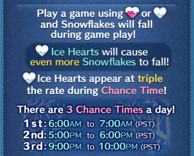 Once you have started the event and are playing with the event card, your hearts will change to snow hearts and some will randomly be Ice Hearts. When you play a game using a Snow or Ice Heart (the left most heart on your hearts list is the heart you use to play that game) snow flakes will fall during the game! You collect snow flakes to earn points for your card. When you play with an Ice Heart, the snowfall during the game will increase. Three times during the day there will be "Chance Time" where you are more likely to get Ice Hearts. These times are: